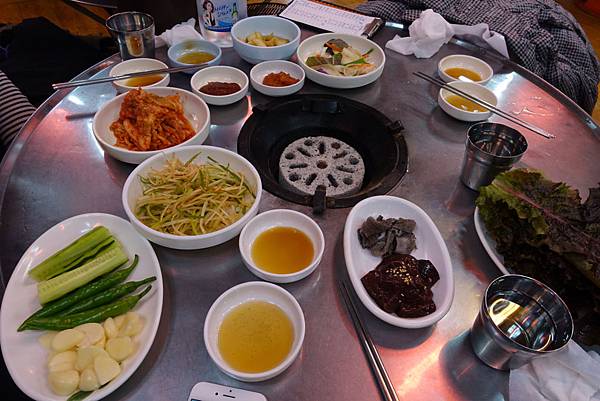 這兒是專賣韓肉的市場。是杜如風之前介紹過的原故罷?最近好像蠻多香港旅客到此,我們吃晚飯時就已經遇上好幾台香港旅客,其他國家的旅客反而不太多。我們選了網上推介紅色「阿豬媽」做招牌的食店,3人點了 80000 won 的韓牛套餐。